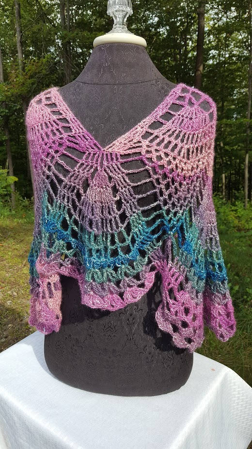 This gorgeous hand-crocheted pineapple shawl will be your go-to this fall! Created in beautiful shades of purples, pinks, blues and greens, it can be worn two ways.