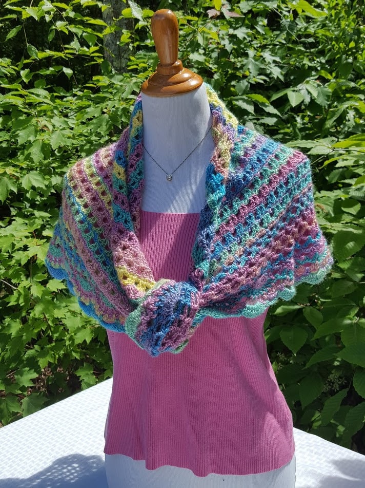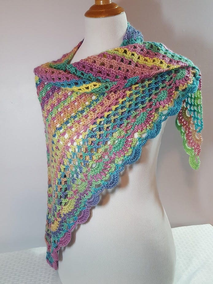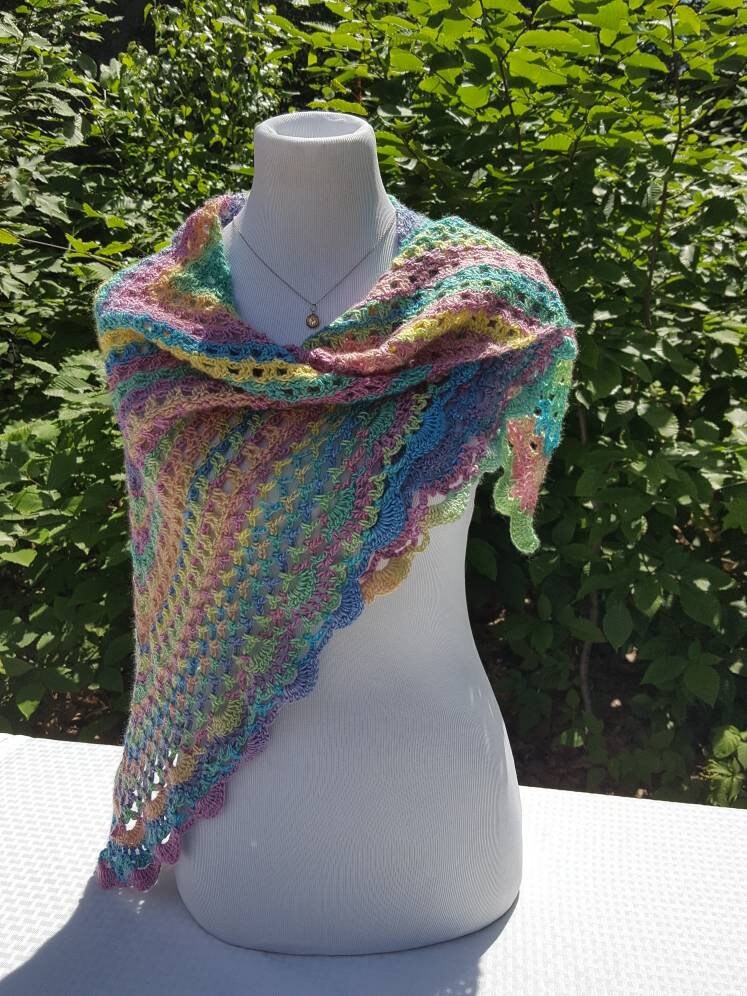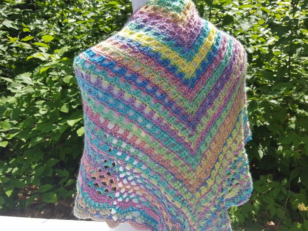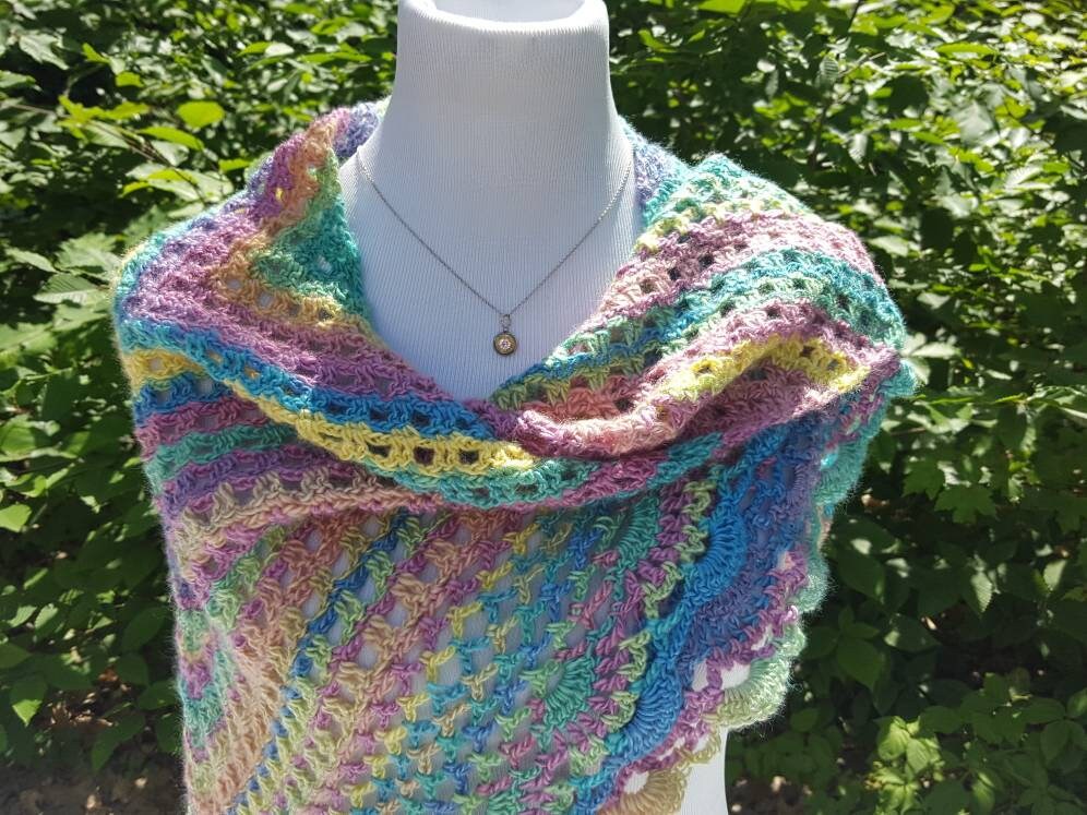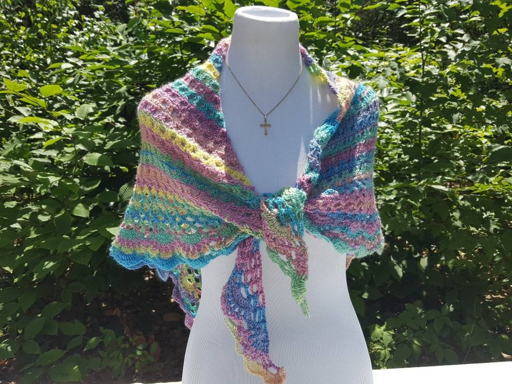 Introducing a beautiful crocheted lace shawl in gorgeous rainbow candyland colors! Showing off mixes of blues, yellows, pinks, greens, and shades of purple, can you imagine the possibilities? Wear over a white tee and jeans, pair with a summer sundress, or even as a sarong over your bathing suit at a beach wedding, there are so many ways to show off these lovely colors!