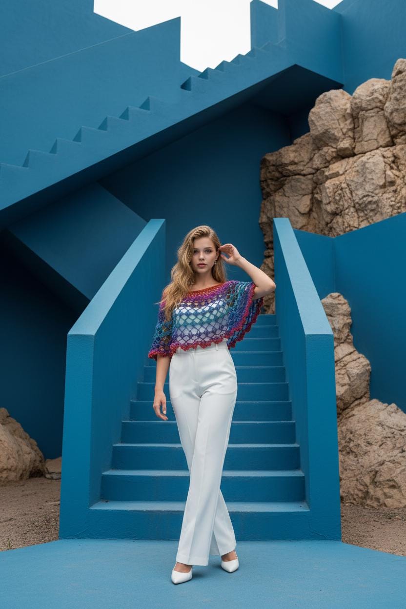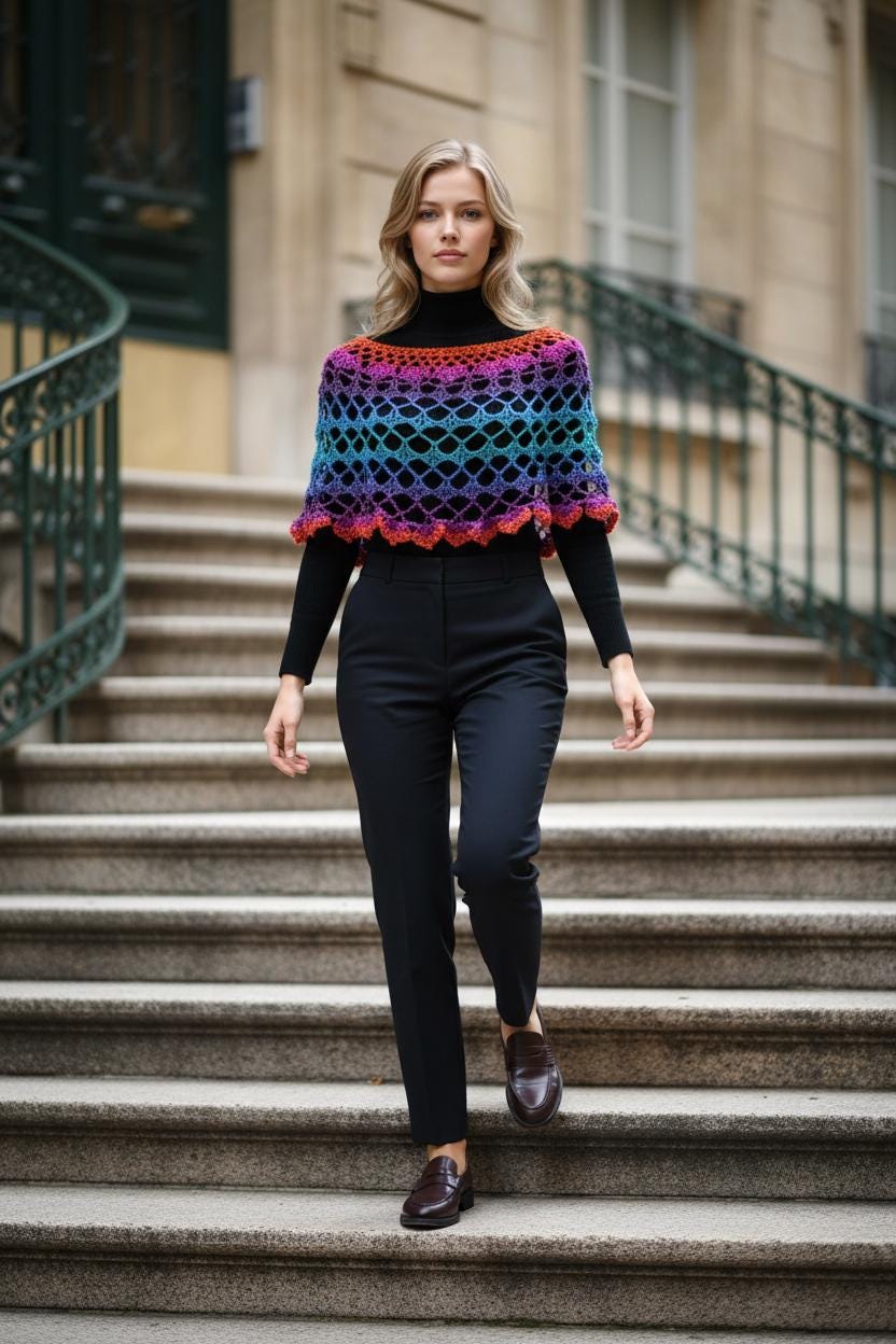 Who doesn't love color? Crocheted in a beautiful open-weave style in shades of lavenders, oranges, reds, pinks, and blues, with bits of sparkle, you can wear this poncho over your favorite blouse or turtleneck. It's so versatile, it can even been worn over a mini skirt or your favorite leggings! Shown is a size women's sm-med.